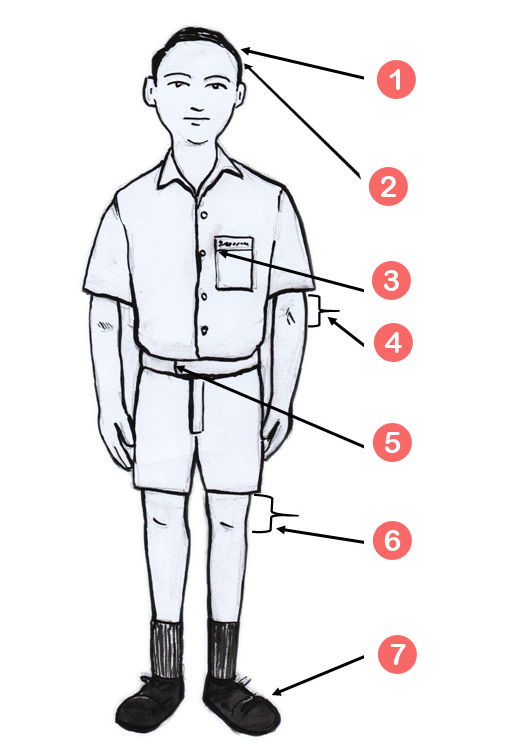 • හිස මුදුන කොටස කොණ්ඩය දිග අඟල් 2කි. හිස පැත්තේ කොටස හා මුදුන කොටස වෙන් වෙන් වශයෙන් පෙනෙන සේ නොතිබිය යුතුය.