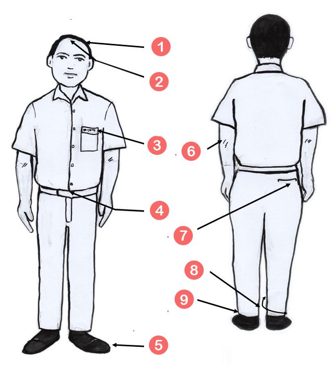 • කලිසමේ පසුපස සාක්කුව දකුණු පසින් තිබිය යුතුය.