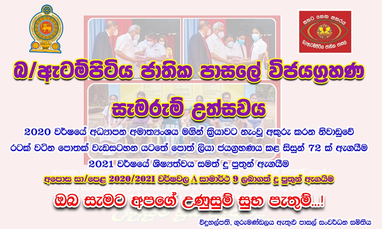 In covid 19 period school vacation has offered the programme of “Ratak vatina Pothak”. To write a book at home. This programme has been organized for students to become an author, upgrading their creative abilities. It has also been planned to offer distinctions for hundred (100) best creative books from selected ten thousand (10,000) creations from island-wide and those hundred books are to be printed. The rest of the 9900 creations are expected to be published on electronic media by the Ministry of Education. Our school participated to that and we wrote many books. Finally Atampitiya National School, Uva Province is in the forefront among the schools that have written the largest number of books in the “A book worth a country” program.